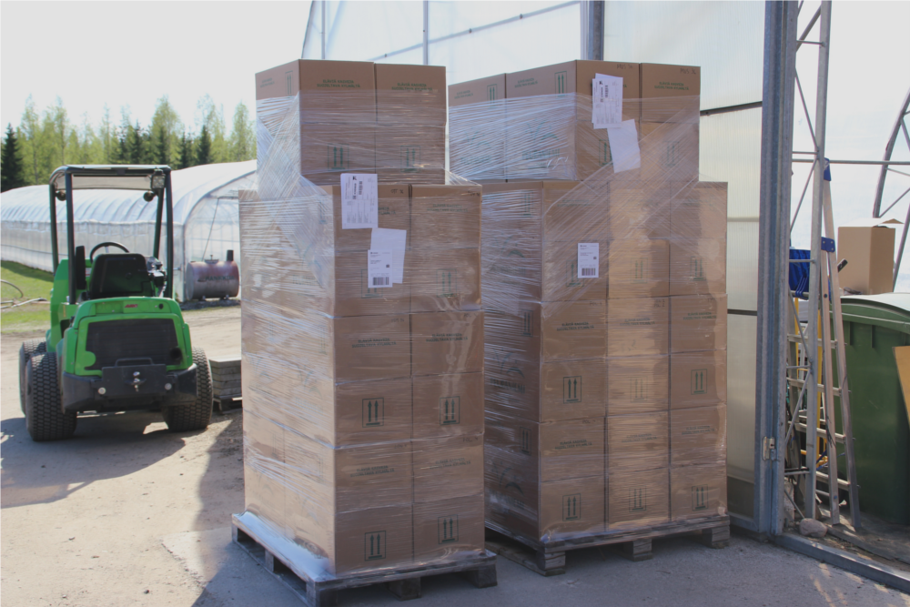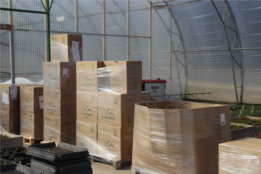 Taimet pakataan kasvatuskennoissaan tai -ruukuissaan pahvilaatikoihin. Laatikot voidaan lähettää sellaisenaan tai suuremmissa määrissä rahtilavoilla. Pakkausmäärät pahvilaatikoihin ovat mansikalla enintään 264 kpl, lakalla 160 kpl ja vadelmalla 18 tai 36 kpl (koosta riippuen). Yhdelle FIN-lavalle mahtuu 18 - 24 laatikkoa. Pensaiden lähetyksissä käytetään lavakauluksia tai pahvisia kontteja.
